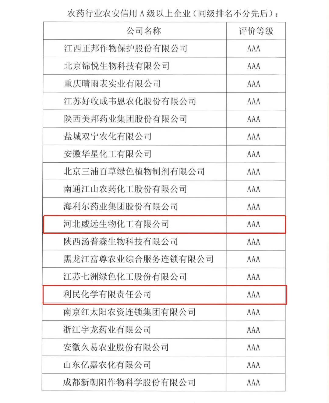 本次评选经过企业自愿申报、材料审核、专家评审,从89家企业中评出农药行业农安信用评价A级以上农药生产经营单位60家。利民股份三家子公司利民化学、威远生化分别荣获AAA级、双吉化工荣获AA级评价。