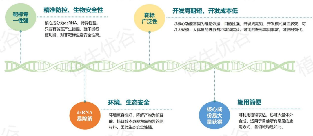 RNA生物农药带来了全新的生物农药开发理念,改善了以往传统化学农药靶点开发难的特点,直接以丰富多样的mRNA为作用靶点,使得成药更加精准、有效。同时可以根据田间病虫害发生规律,通过多核酸策略,设计智能高效的立体防控体系。因此,RNA生物农药被称为“农药史上的第三次革命”,也被预测为“未来十年将要爆发的颠覆性技术”。