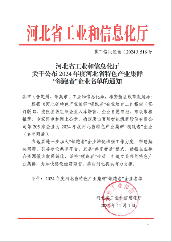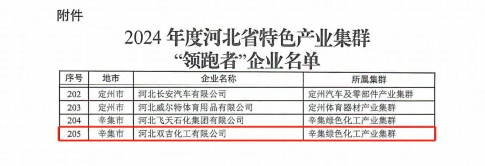 近日,河北省工业和信息化厅公布《关于2024年度河北省特色产业集群“领跑者”企业名单》的通知,经过一系列严格的评审程序,利民股份子公司双吉化工凭借科技创新、绿色低碳、质量品牌发展方面的卓越表现,成功入选“领跑者”名单。