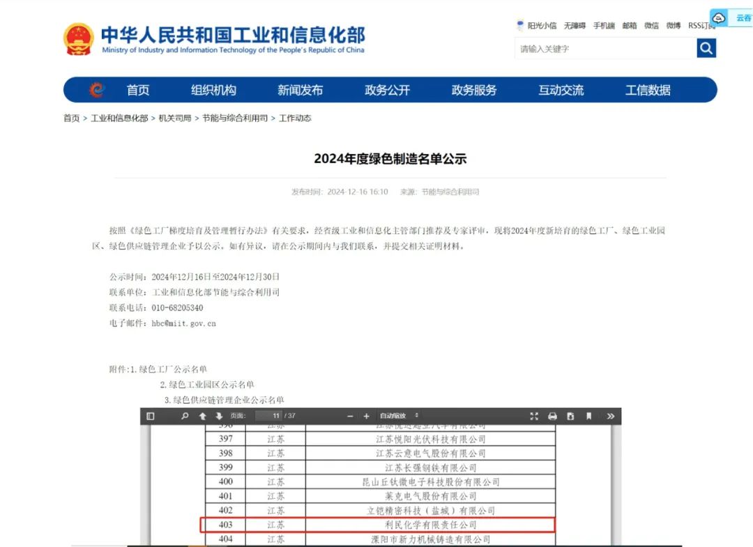 近日,国家工信部发布《2024年度绿色制造名单》,利民股份全资子公司利民化学经省级工业和信息化主管部门推荐及专家评审,成功跻身国家级“绿色工厂”行列,标志着公司在低碳环保和可持续发展方面取得了显著成绩。