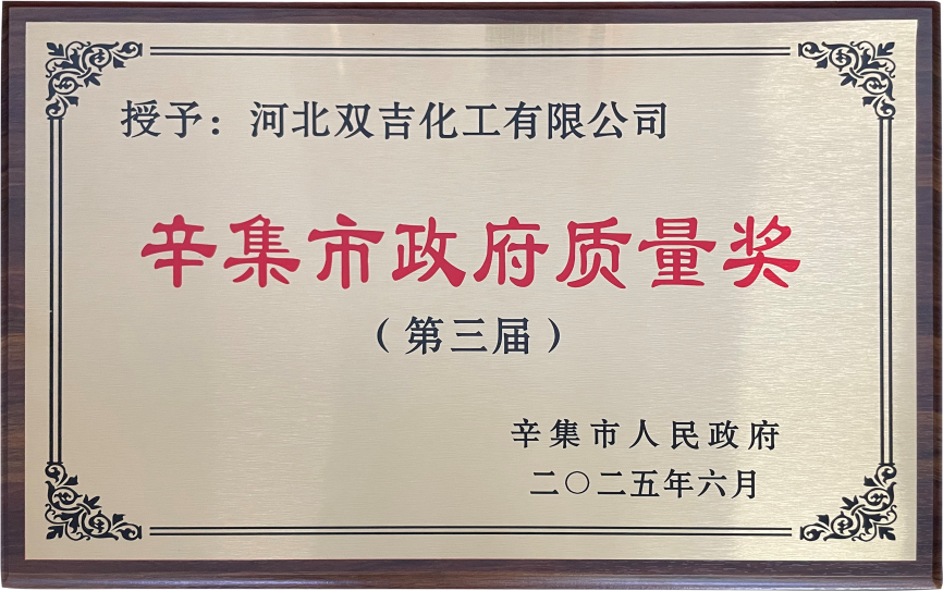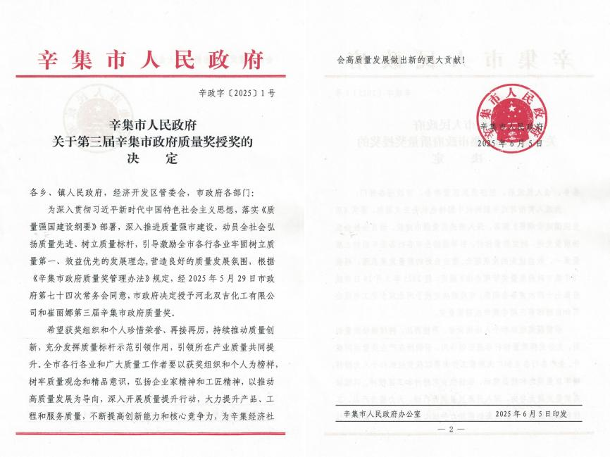 辛集市政府质量奖是授予在质量管理、产品品质、创新能力和管理效能等方面达到国内行业领先水平,并为辛集经济社会发展作出突出贡献的组织与个人的重要荣誉。此次获奖,不仅体现了辛集市政府对双吉化工长期践行“创新驱动、绿色发展”理念的高度认可,更是对其持续深耕质量管理、引领行业高质量发展的肯定。