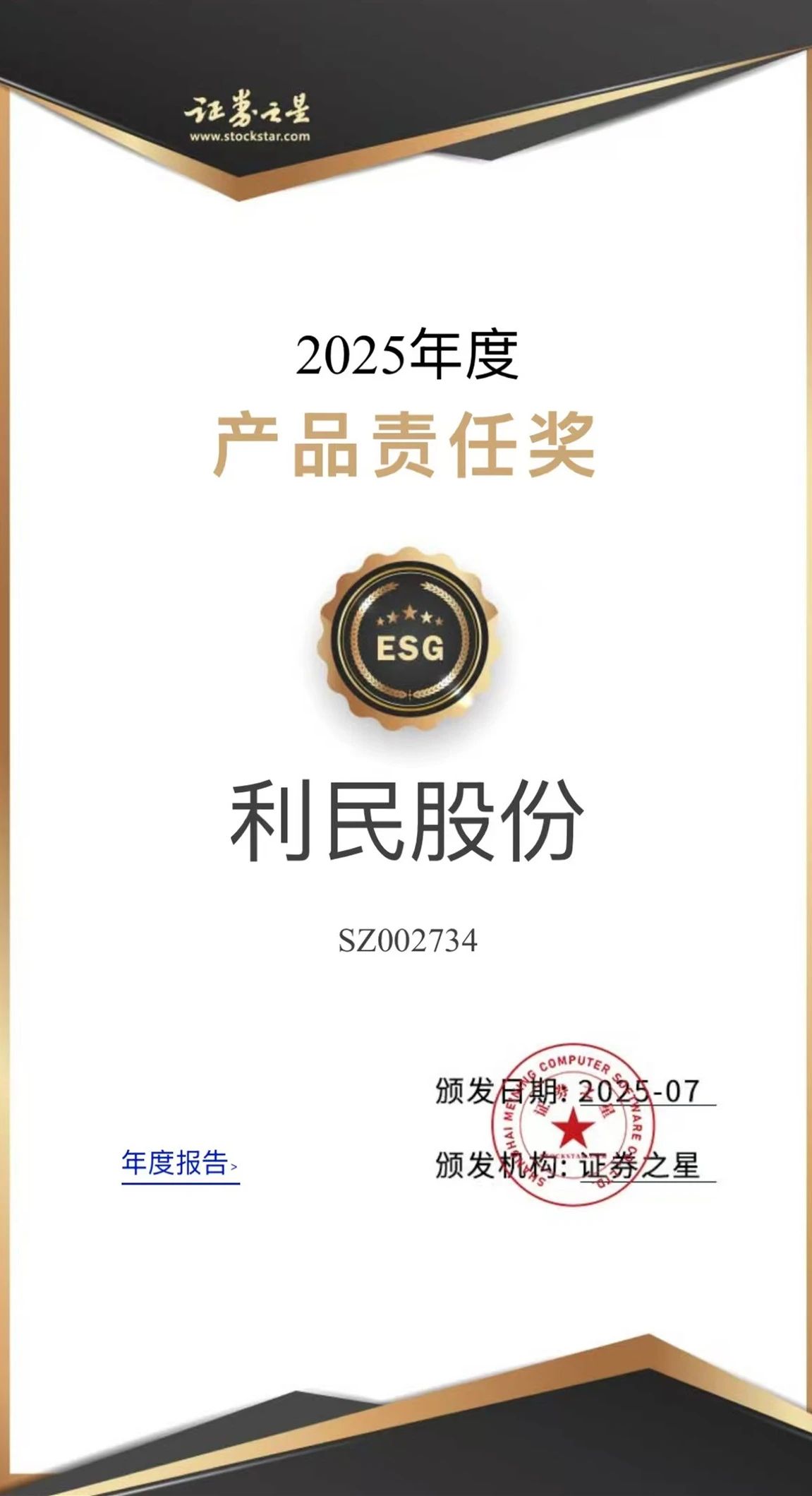 会上,利民股份凭借在ESG创新实践、绿色可持续发展、提质增效等方面的优秀表现,荣获 2025 证券之星“ESG 新标杆企业奖——产品责任奖”。“新标杆企业奖”是证券之星携手专业数据研究机构,基于上市公司的多元信息评选而出。该奖项旨在寻找经济效能与社会责任并重的绿色企业,传播推广ESG工作的成熟经验,为中国 ESG 发展提供示范性样本。