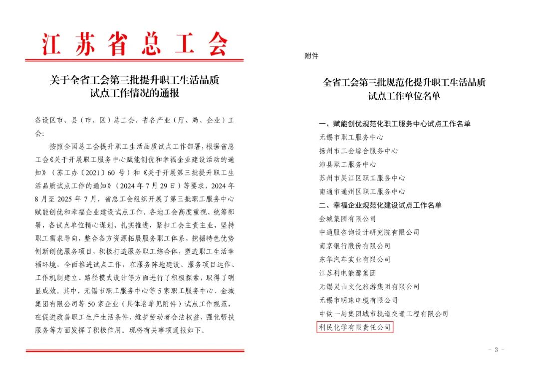 近日, 利民股份 子公司利民化学荣获 江苏省总工会 授予的“江苏省规范化提升职工生活品质试点单位”称号。标志着利民化学在探索高质量发展与职工幸福融合共生的道路上,迈出了坚实一步。
