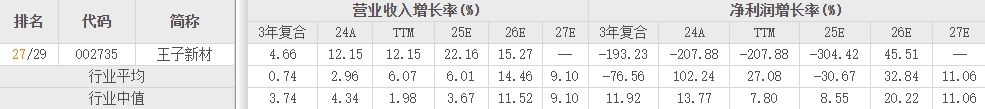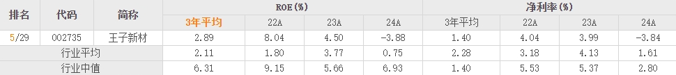 具体年份来看,在2024年,王子新材的ROE为-3.88%、净利率为-3.84%,比以往都大幅降低,并且都低于行业平均水平、行业中值。
