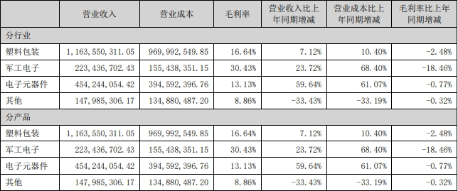 问题就出在营业成本上,虽然主营业务营业收入上升了,但其相应的营业成本也上升了,并且上升得更快。其中,塑料包装方面营业成本上升10.40%,军工电子和电子元器件分别上升68.40%和61.07%;哪怕其他业务,其营业成本下降的幅度也低于其营业收入。