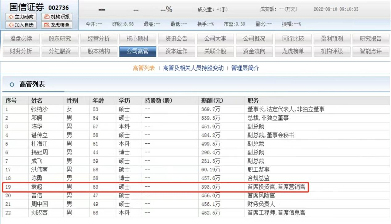 据东方财富网数据显示,袁超在国信证券的薪酬为393万元。而公司其他高管的薪酬也惊人,大多数都是300多万至500多万元,高于400万的至少有9人,在国信证券高管中,袁超的薪酬还算低的。