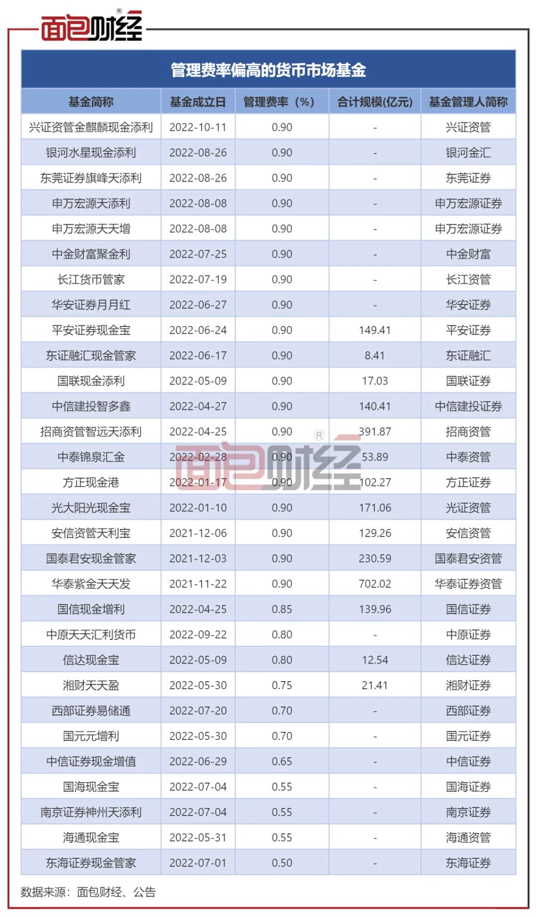 据统计,目前有30余只货基的管理费超过0.5%,其中有19只货基更是达到0.9%,高出同类均值2倍以上。其中,国信证券旗下产品国信现金增利的规模靠前,管理费率高达0.85%,仅次于行业第一梯队。