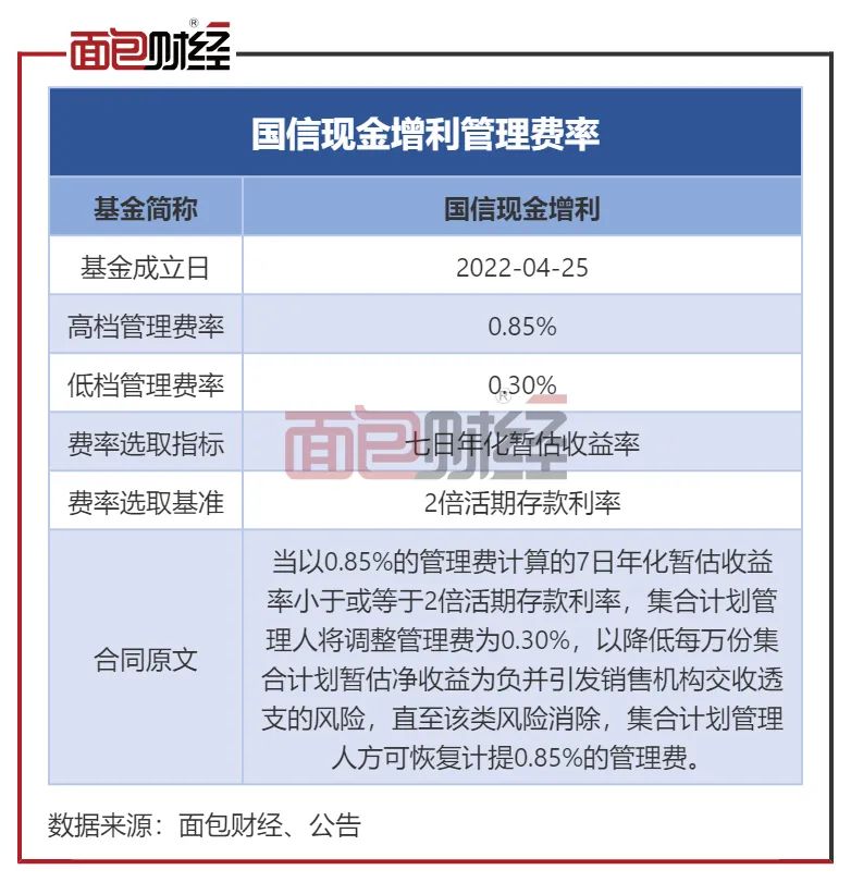 公募化转型后,国信现金增利采取分档浮动管理费率。当产品七日年化暂估收益率小于或等于2倍活期存款利率,则收取0.3%管理费;否则按0.85%收取管理费。