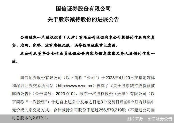 7月26日,国信证券发布公告表示,公司曾于2023年4月20日披露《关于股东减持股份预披露的公告》表示,股东一汽股权投资(天津)有限公司(以下简称“一汽投资”)计划自公告发布之日起3个交易日后的6个月内以集中竞价或大宗交易方式,合计减持公司股份不超过2.57亿股(不超过国信证券当时总股本的2.67%)。