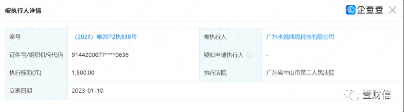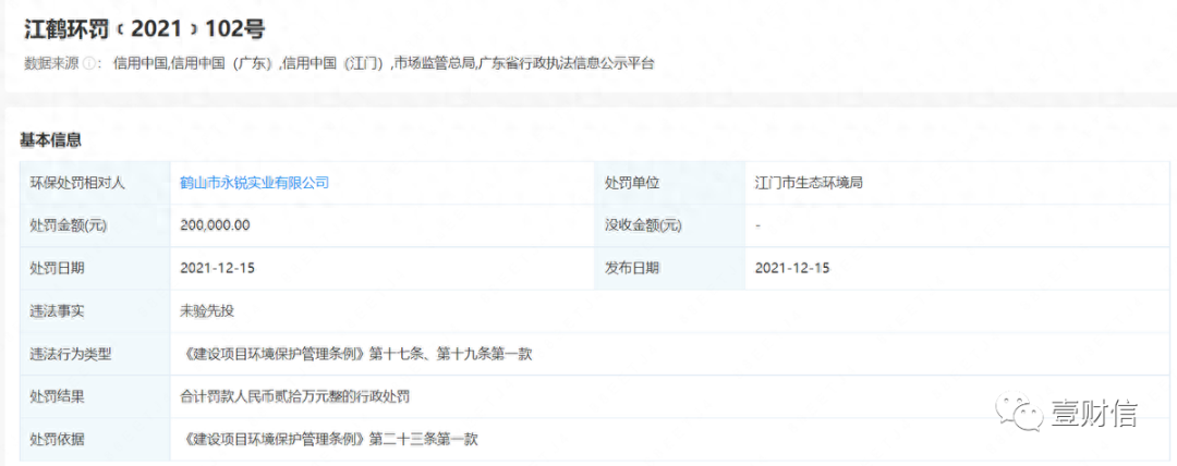 资料显示,广东永锐今年1月被广东省中山市第二人民法院列为被执行人,执行标的1,500.00元。此外,2021年12月15日,鹤山永锐因建设项目未验先投违反相关条例,被江门市生态环境局给予罚款20万元的行政处罚。