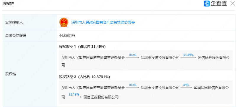 信息显示,深圳国资委是国信证券的实控人,间接持有其44.36%的股份。