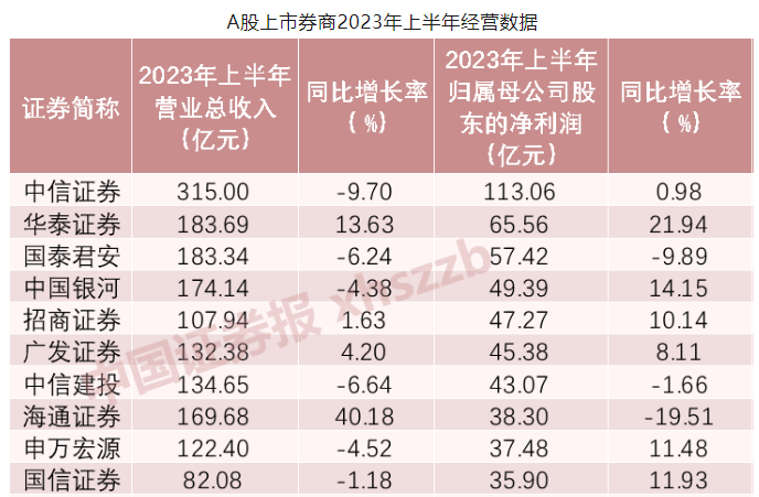 今年上半年,国信证券营为82亿元,同比下滑约1.2%;归母净利润为35.9亿元,同比增长11.9%。其营收规模在A股上市券商中,排名第8。