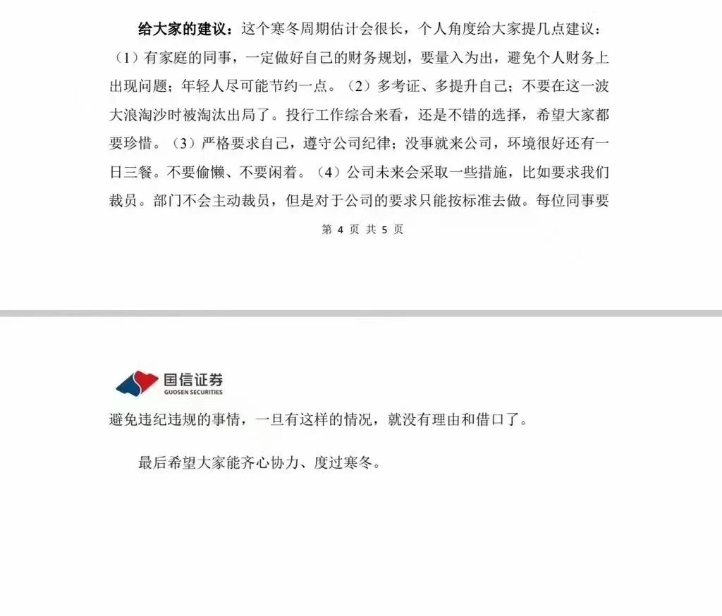 国信证券内部信指出,这个寒冬周期估计会比较长,给员工一些建议。就在去年,其业绩也遭遇了滑坡。