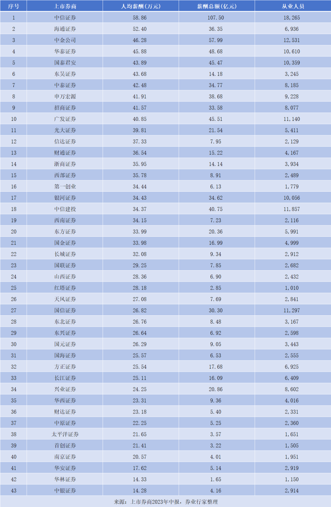 截至2023年上半年末,国信证券从业人员11297名。以此计算,人均薪酬为26.82万元,排名第27位。而其余头部券商的人均薪酬,无一例外,均在TOP20以内。净利润排名第11-20的券商中,也只有兴业证券(24.25万元)、长江证券(25.11万元)、方正证券(25.54万元)和国元证券(26.29万元),人均薪酬低于国信证券。