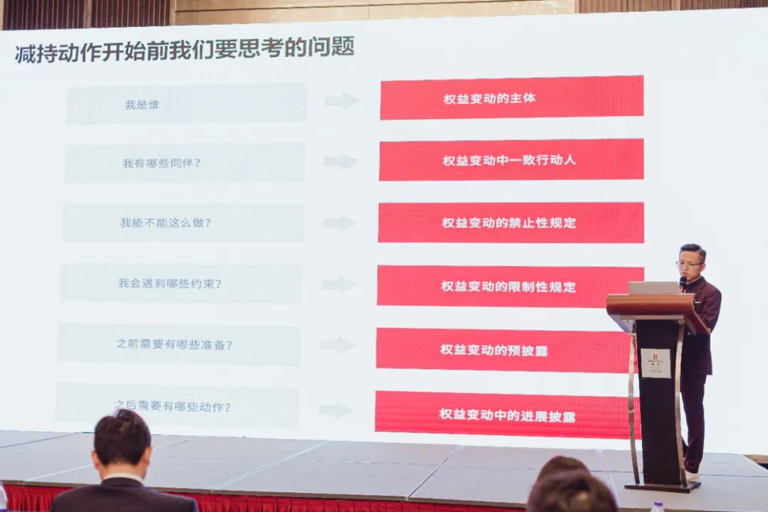 ▲价值在线咨询高级合规顾问王阳就“减持新规解读、回购股份用于股权激励及员工持股计划的实践分享”两方面进行了专题解读。