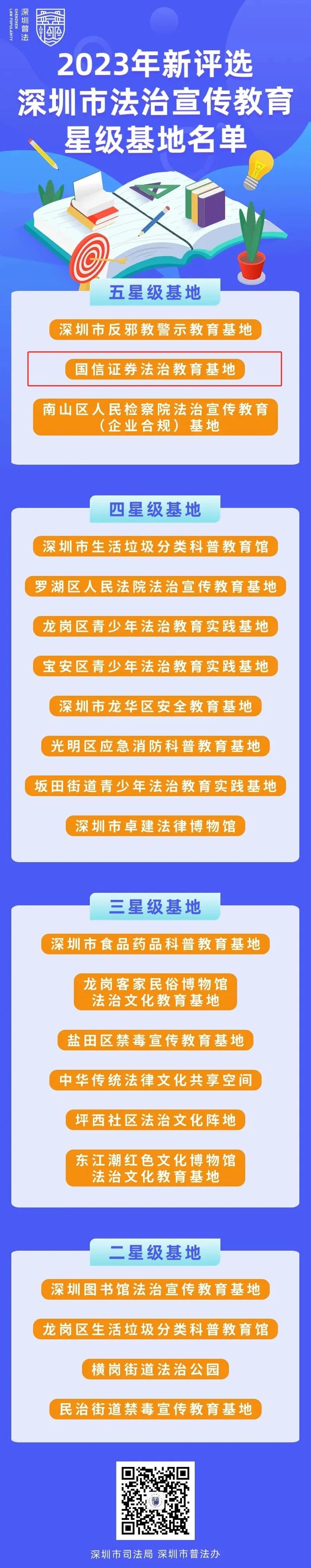 近日,深圳市司法局、深圳市普法办组织开展2023年法治宣传教育星级基地评选活动,经过符合性审查、实地考察、专家现场评审等多个环节的考核评比,市属国企国信证券法治宣传教育基地获评深圳市五星级法治宣传教育基地,为全市三家获评最高等级的五星级基地之一。
