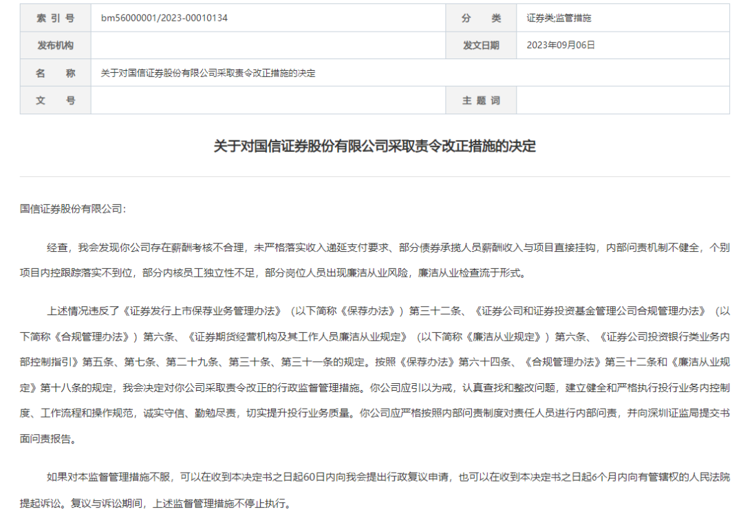 今年9月1日,证监会点名国信证券存在薪酬考核不合理,未严格落实收入递延支付要求、部分债券承揽人员薪酬收入与项目直接挂钩,内部问责机制不健全,个别项目内控跟踪落实不到位,部分内核员工独立性不足,部分岗位人员出现廉洁从业风险,廉洁从业检查流于形式的情况。