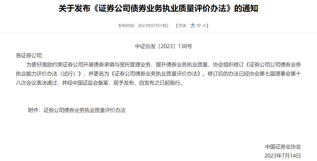 据悉,中国证券业协会组织修订了《证券公司公司债券业务执业能力评价办法(试行)》,并更名为《证券公司债券业务执业质量评价办法》。经中证协第七届理事会第十八次会议表决通过,并经证监会备案,于今年7月发布实施。