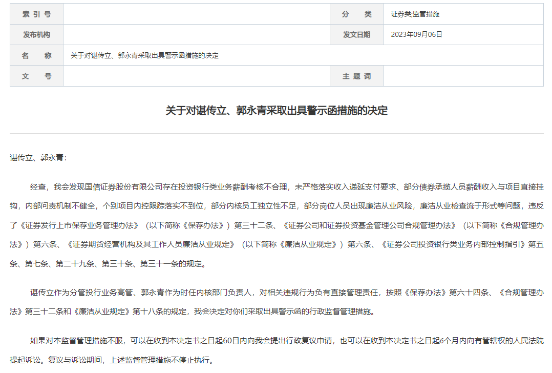 分管投行业务高管谌传立,时任内核部门负责人郭永青,因对相关违规行为负有直接管理责任,也双双被监管警示。