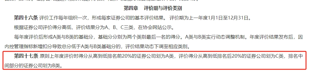 新华财经和面包财经研究员梳理《评价方法》发现,在评价期内存在“未按要求报送评价材料的;项目处罚处分指标得分为0的;产生严重不良社会影响等其他协会认为应当纳入的”情形之一的证券公司为C类。