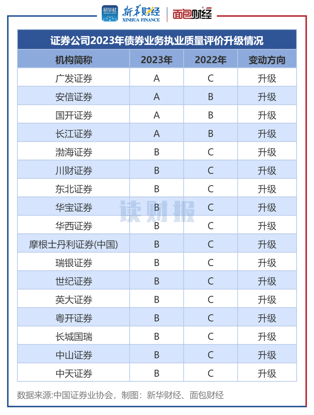 另外,2023年度的考评结果中,有17家证券公司的债券业务执业质量评价被协会升级。