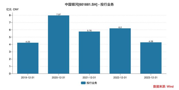 然而,挑战同样不小。根据wind数据,中国银河近些年投行业务确实不见起色,2020年在市场行情大好的时候由2019年的4.23亿元增长到了2020年的7.97亿元,但是之后就一路下滑,最后到2023年下跌至2023年的4.28亿元。