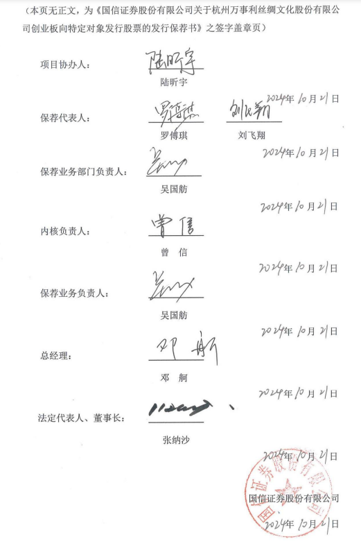 而在11月19日,由国信证券担任保荐机构签发的万事利非公开发行项目,刚刚提交注册。日期显示为2024年11月21日的签字栏显示,吴国舫为保荐业务负责人兼保荐业务部门负责人。