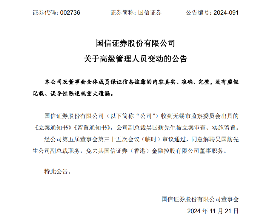 公告显示,国信证券收到无锡市监察委员会出具的《立案通知书》《留置通知书》,副总裁被立案审查,实施留置。经第五届董事会第三十五次会议(临时)审议通过,同意解聘吴国舫先生公司副总裁职务,免去其国信证券(香港)金融控股有限公司(简称:国信香港)董事职务。