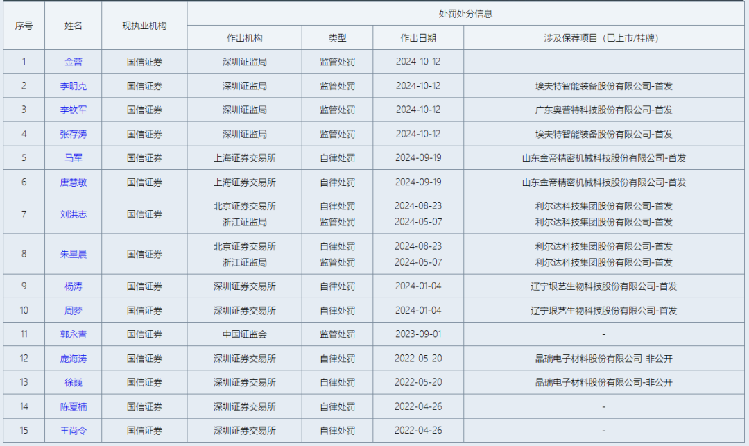 今年年内,国信证券新增10名C类保代,其中两名保代“双罚”。行家查看了入榜保代的履历,均因为在国信证券承担项目违规受罚。