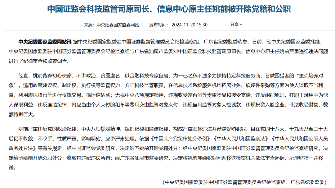 中央纪委国家监委网站在当日15时30分“双更”:证监会科技监管司原司长、信息中心原主任姚前被“双开”;证监会原法律部副主任吴国舫接受纪律审查和监察调查。