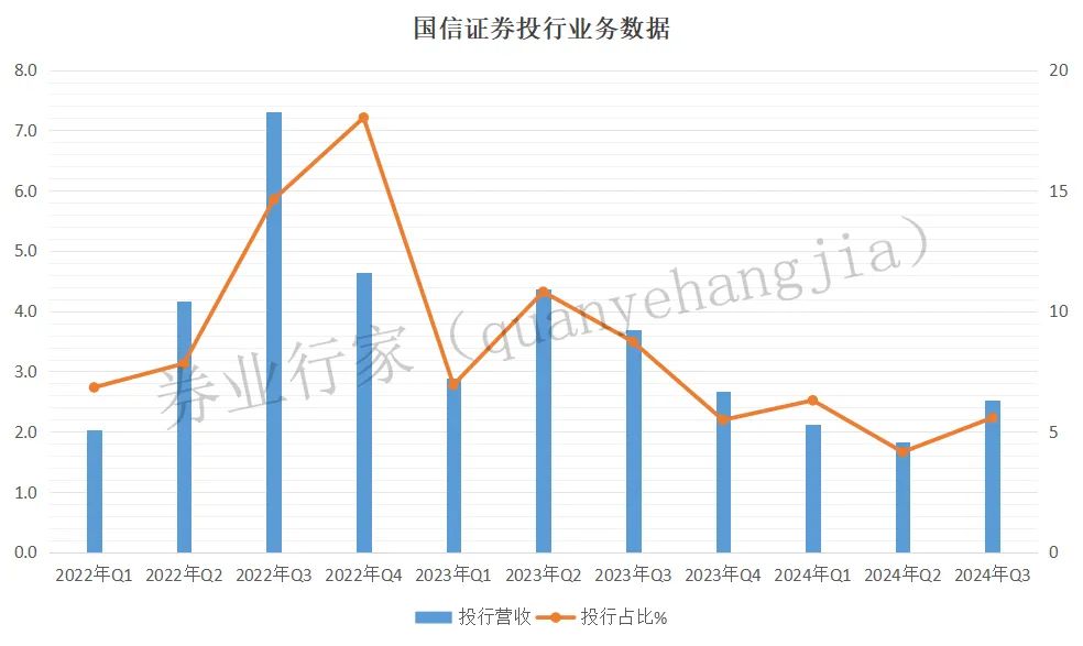 对照国信证券定期报告:今年二季度,投行业务揽收1.83亿元,占总营收的比例为4.15%,双双创下新低。今年三季度,投行业务揽收2.52亿元;投行业务占比为5.58%,也低于上一年各季度水平。