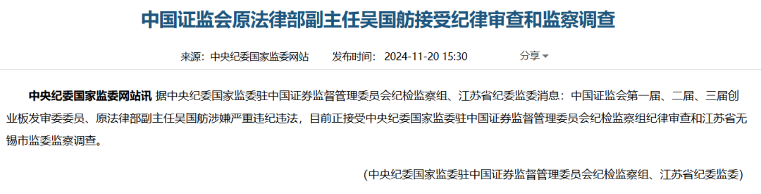 公告显示,吴国舫的头衔是“证监会第一届、二届、三届创业板发审委委员、原法律部副主任”。本次出手调查的是“中央纪委国家监委驻中国证券监督管理委员会纪检监察组”和“江苏省无锡市监委”。全文并没有提到其在国信证券的高管任职。
