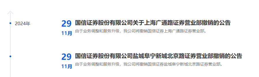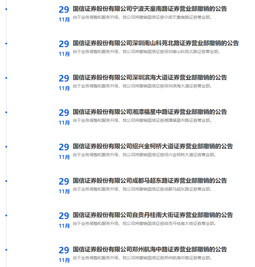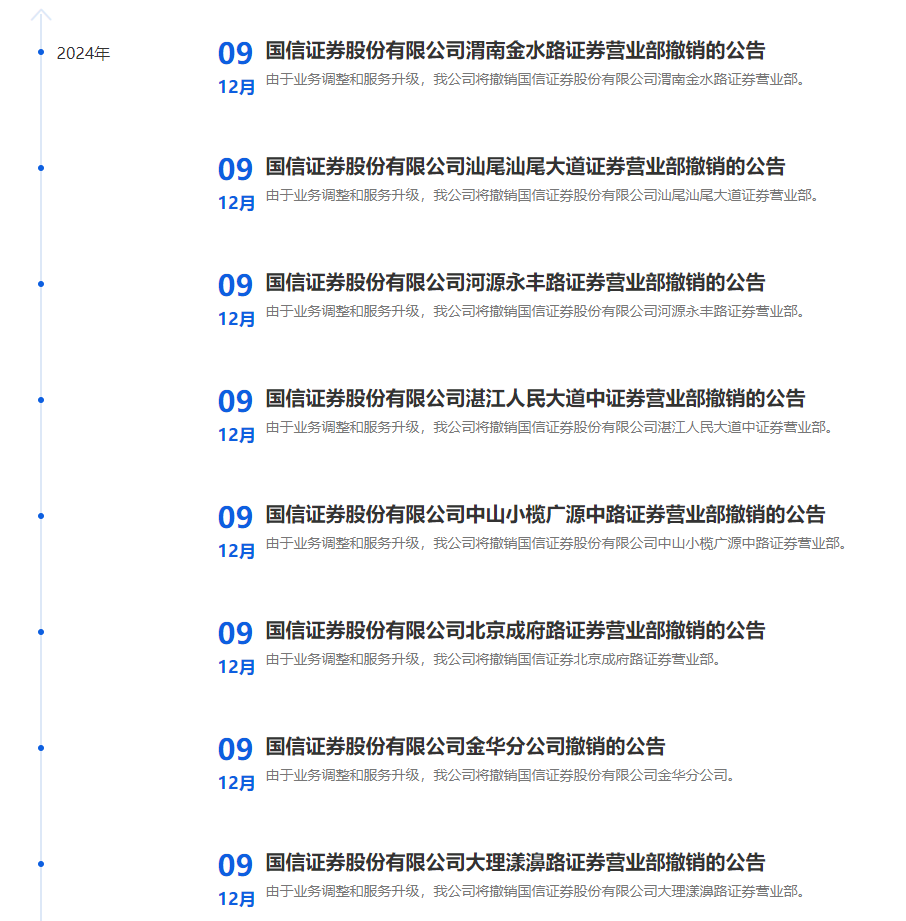 12月9日,国信证券发布公告称,该公司将撤销金华分公司、北京成府路证券营业部、湛江人民大道中证券营业部等8家分支机构。上述分支机构届时将关闭营业场所并停止营业,自2025年1月10日下午3:00后不再接受网上(包括手机APP)和现场业务申请。