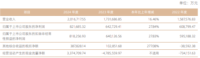 2024年度,国信证券营业收入为2,016,717.55万元,同比增长16.46%;归属于上市公司股东的净利润821,685.32万元,同比增长27.84%;归属于上市公司股东的扣除非经常性损益的净利润818,256.93万元,同比增长27.83%;经营活动产生的现金流量净额3,374,709.74万元,上年同期为-4,785,559.97万元。