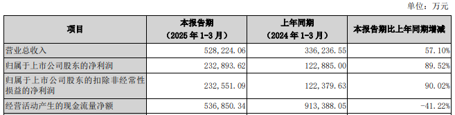 2025年第一季度,国信证券营业收入为528,224.06万元,同比增长57.10%;归属于上市公司股东的净利润232,893.62万元,同比增长89.52%;归属于上市公司股东的扣除非经常性损益的净利润232,551.09万元,同比增长90.02%;经营活动产生的现金流量净额536,850.34万元,同比下降41.22%。