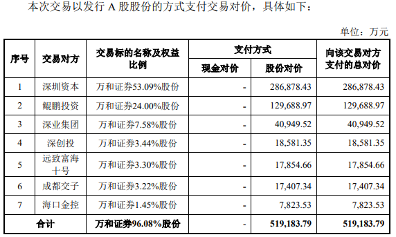 国信证券2025年6月11日披露的发行股份购买资产暨关联交易报告书(草案)摘要(上会稿)显示,本次交易的整体方案为公司拟通过发行A股股份的方式向深圳资本、鲲鹏投资、深业集团、深创投、远致富海十号、成都交子、海口金控购买其合计持有的万和证券96.08%的股份,本次交易不涉及募集配套资金。本次交易完成后,万和证券将成为公司的控股子公司。