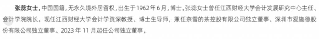 公开资料显示,张蕊出生于 1962 年,曾任江西财经大学会计发展研究中心主任、会计学院院长,现任江西财经大学会计学资深教授及博导。除担任国信证券独立董事外,还兼任奈雪的茶和深圳市爱施德股份有限公司(下称"爱施德")两家上市公司的独立董事。