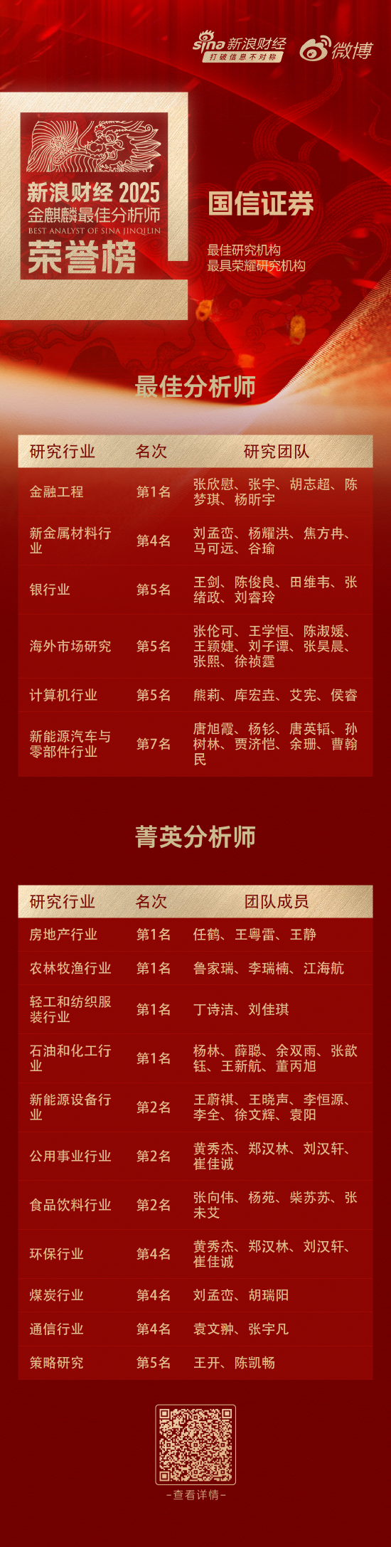 11月28日,第七届新浪财经金麒麟最佳分析师评选结果揭晓, 国信证券 研究团队荣获“最佳研究机构第十名”、“最具荣耀研究机构第六名”。