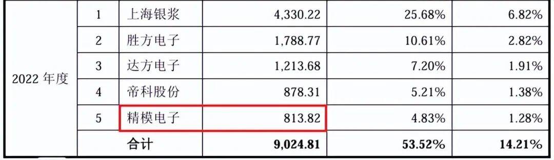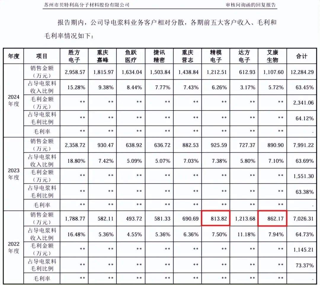 不过招股书(签署日期为2025年6月23日,下同)披露的导电材料业务前五大客户表显示,2022年精模电子以813.82万元的交易金额排在第五位,而问询回复中披露交易金额更高的艾康生物却并不在前五大客户之列。
