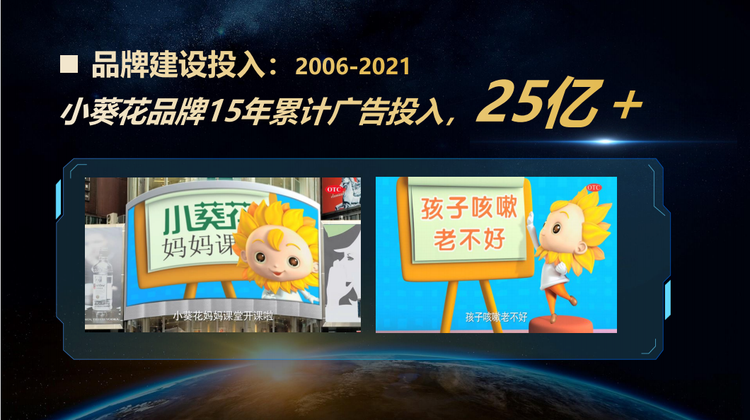 有了前期每年1500万的投入,从2006年开始,我们着力于将小葵花打造成儿药领域的超级品牌。从2006年到2021年,我们在15年里总计投入广告费用超过25亿,这才有了品牌资产的沉淀和积累,为接下来的品牌升级打下了坚实的基础。