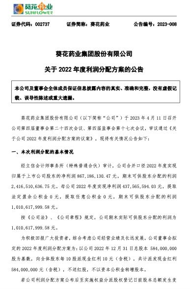 4月11日,葵花药业集团股份有限公司(以下简称“葵花药业”或“公司”)发布年度业绩报告称,公司2022年营业收入约50.95亿元,同比增加14.2%;归属于上市公司股东的净利润约8.67亿元,同比增加23.05%;基本每股收益1.48元,同比增加22.31%。公司同时发布了关于2022年度利润分配方案的公告:以公司2022年12月31日总股本584,000,000股为基数,向全体股东每10股派现金红利10元(含税),共计派发现金红利584,000,000元(含税)。