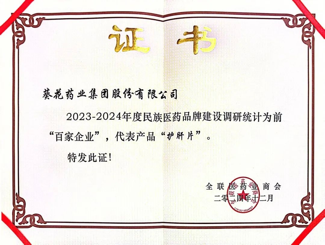 会上,葵花药业集团凭借其卓越的品牌影响力和市场表现,被评为2023-2024年度民族医药品牌建设的“百家企业”之一。“护肝片”因其良好的口碑,在市场上获得了广泛的认可,被评为企业代表产品。