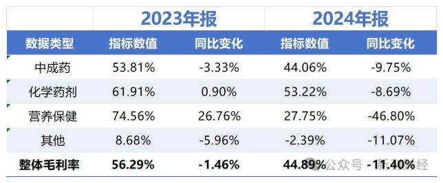 盈利能力的萎缩,从毛利率的同向波动可窥一斑。从56.29%下滑至44.89%,2024年葵花药业整体毛利率下降了11.40个百分点,其中占营收比例最大的中成药板块下降9.75个百分点,化学药剂下降8.69个百分点,而营养保健及其他业务板块,前文提到其销量尚能微涨,但此处可见其毛利下降更甚。