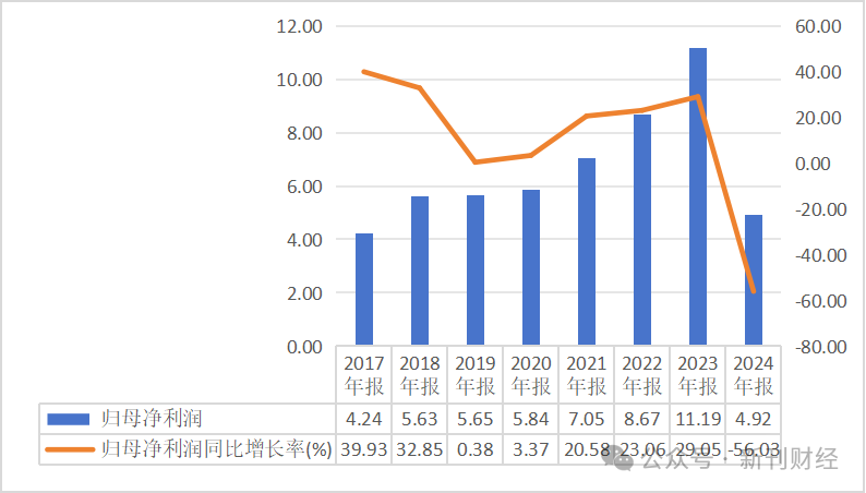年报数据显示,葵花药业2024年归母净利润4.92亿元,同比下降56.03%;扣非净利润3.45亿元,同比下降65.65%。归母净利润在经历了连续7年的上涨之后,2024年惨遭腰斩,直接回到了7年之前的水平。
