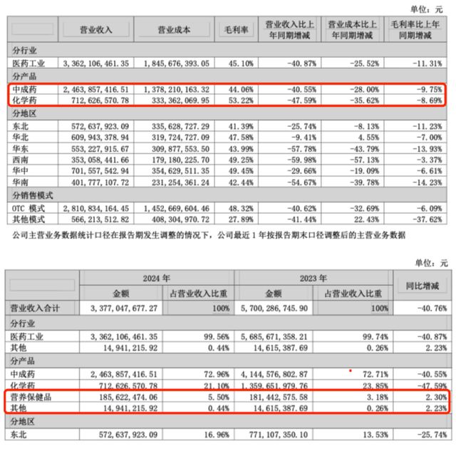 对于2025年上半年业绩的大幅下滑,葵花药业在业绩预告中给出了解释。公司表示,医药行业整体呈现结构性调整态势,受前期市场形势非理性波动因素影响,公司产业链下游医药商业端备货、终端用户囤货,上半年产业链整体库存仍呈充盈态势。为了应对这一情况,2025年上半年,公司继续进行下游渠道梳理,控制发货总量、降低渠道各链条库存。此外,公司库存原材料成本处于高位,加之生产规模下降固定成本分摊增加,导致营业成本上升,进而对产品销售毛利率也产生了较大影响。