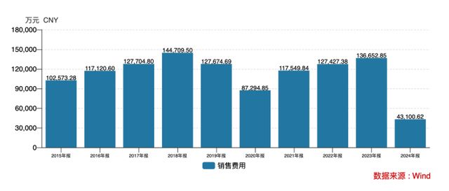 不过,这一营销投入节奏在2024年发生剧烈转变。当年公司销售费用骤降至4.31亿元,同比大幅缩减68.46%,公司将此归因于“费用管控”。进入2025年,这一趋势仍在延续,一季度销售费用仅为0.82亿元,同比降幅进一步扩大至79.19%。从费用结构看,此前占销售费用约80%的广告及业务宣传费、促销咨询服务费,2024年合计占比已降至50%左右,显示出营销投入方向的明显收缩。