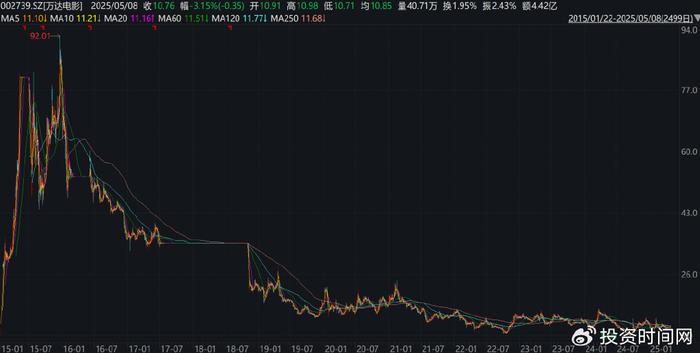 反映在二级市场端,万达电影的股价压力持续加码。自2015年12月触达92.01元/股(前复权)最高峰后,万达电影的股价就逐级下跌。时至2018年,其股价尚能维持在35元/股上下的位置。截至2025年5月8日收盘,万达电影股价收于10.82元/股,总市值约为228亿元。按照最新股价及最高减持数量2941.12万股计算,杭州臻希此次减持所得约为3.18亿元。