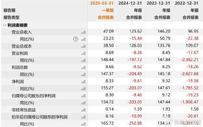 整体来看,2024年,该公司营业总收入实现123.62亿元,同比下降15.44%;归母净利润为-9.40亿元,同比下降203.05%;扣非净利润为-10.99亿元,同比大幅下降252.88%。