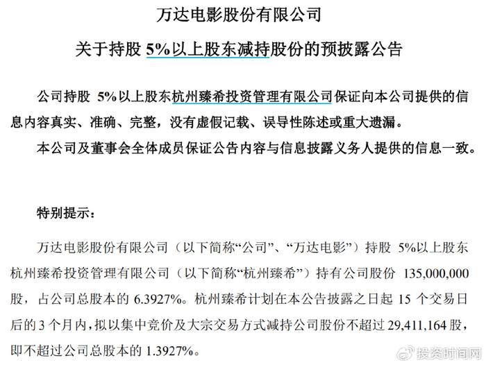 公告显示,基于自身商业安排,持有万达电影5%以上的股东杭州臻希投资管理有限公司(下称杭州臻希),计划以集中竞价及大宗交易方式减持公司股份不超过2941.12万股。