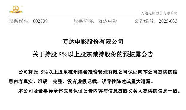 公告显示,杭州臻希持有万达电影1.35亿股,占总股本6.3927%,计划在公告披露之日起15个交易日后的3个月内实施减持,减持原因为自身商业安排。